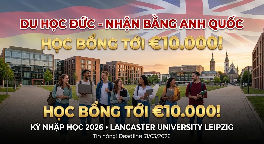 Đại học Lancaster Leipzig (LUL) chính thức công bố chương trình học bổng năm 2026 với giá trị lên đến €10.000 cho bậc Cử nhân và €8.000 cho bậc Dự bị Thạc sĩ. Đây là cơ hội vàng để sinh viên nhận bằng cấp danh giá của Vương quốc Anh ngay tại Đức – một trong những nền kinh tế hàng đầu Châu Âu, với chi phí hợp lý và cơ hội việc làm rộng mở.