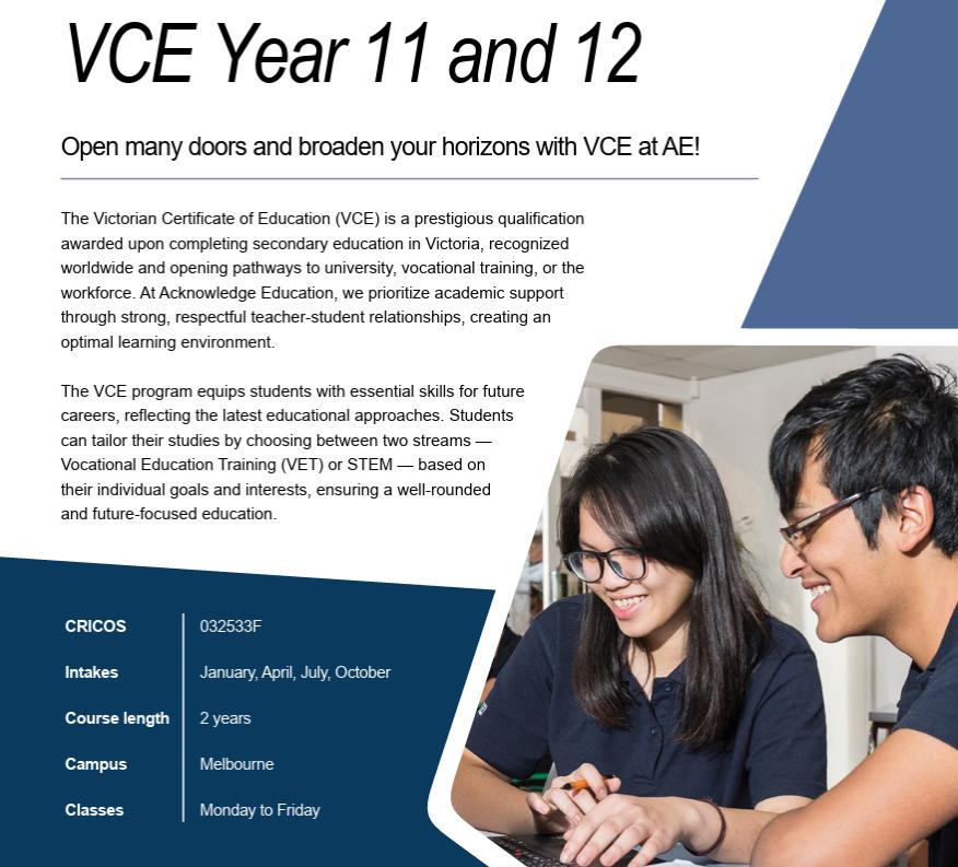 Sau khi hoàn thành VCE, học sinh có thể tiếp tục các chương trình Nghề hoặc Cử nhân tại Acknowledge Education, liên quan đến các chuyên ngành như Human Studies, Cookery, Patisserie, Hospitality Management, Tourism, Civil Construction Design and Construction Project Management, hoặc theo học tiếp tại các trường đại học, cao đẳng khác tại Úc.
