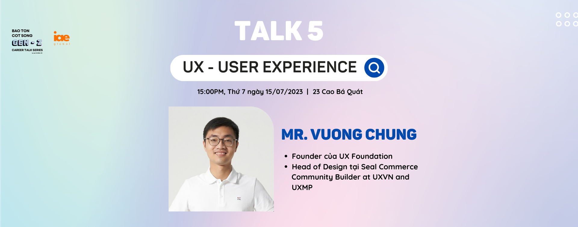 Career Talk là dự án của iae GLOBAL Vietnam nơi các bạn sẽ được nghe những "lão làng" trong nghề chia sẻ, giúp các bạn có cái nhìn tổng quát hơn về nghề đó.