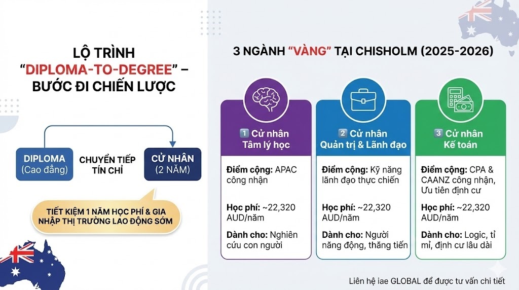 Chisholm Institute là một cơ sở giáo dục công lập thuộc hệ thống TAFE bang Victoria, nổi tiếng với mô hình đào tạo hướng nghiệp thực tiễn mạnh mẽ. Điểm đặc biệt của trường là cơ chế cho phép sinh viên đã hoàn thành Cao đẳng (Diploma) tại Úc hoặc các trường được công nhận tại Việt Nam nhận credit transfer để tốt nghiệp đại học chỉ sau 2 năm học full-time.