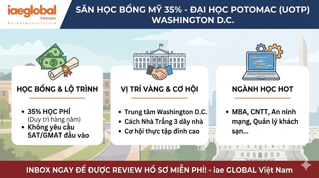 Đại học Potomac (UOTP) là một "viên ngọc ẩn" cho những ai đang tìm kiếm con đường du học Mỹ chất lượng với chi phí tối ưu. Sự kết hợp giữa chương trình học thực tiễn, học bổng 35% hào phóng và sự hỗ trợ chuyên nghiệp từ mạng lưới toàn cầu của iae GLOBAL sẽ là bệ phóng vững chắc cho tương lai của bạn.