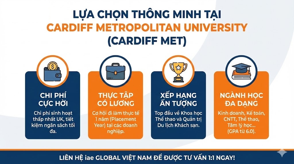 Cardiff Metropolitan University (Cardiff Met) tọa lạc tại Cardiff – thủ phủ năng động của xứ Wales. Đây là một trong những thành phố an toàn và có chi phí sinh hoạt phải chăng nhất tại Anh Quốc, thu hút sinh viên quốc tế từ hơn 140 quốc gia trên thế giới.