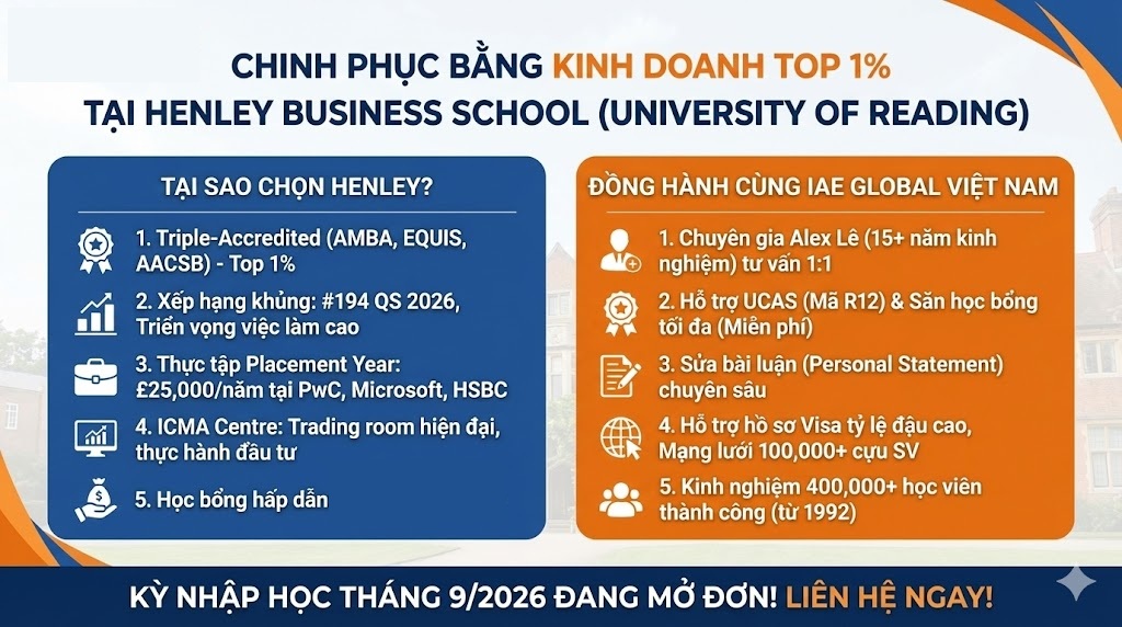 Henley Business School (thuộc University of Reading) là một trong những ngôi trường kinh doanh lâu đời và uy tín nhất châu Âu (thành lập năm 1945). Đối với phụ huynh và học sinh Việt Nam, Henley là bảo chứng cho chất lượng đào tạo đẳng cấp quốc tế.