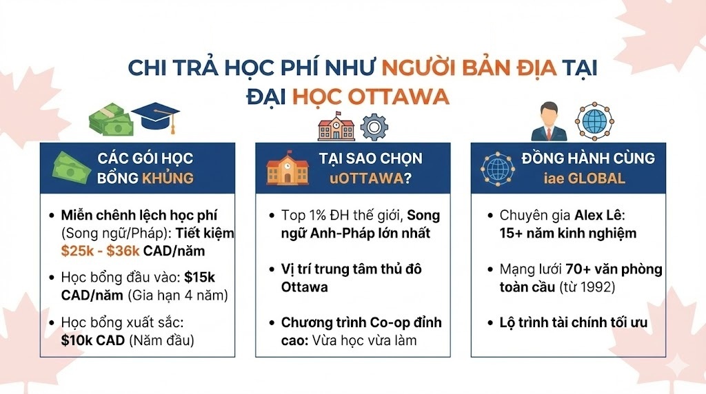 Dựa trên cập nhật mới nhất từ ban tuyển sinh, lộ trình tài chính tại uOttawa được chia làm hai hướng rõ rệt cho sinh viên từ iae GLOBAL Việt Nam: