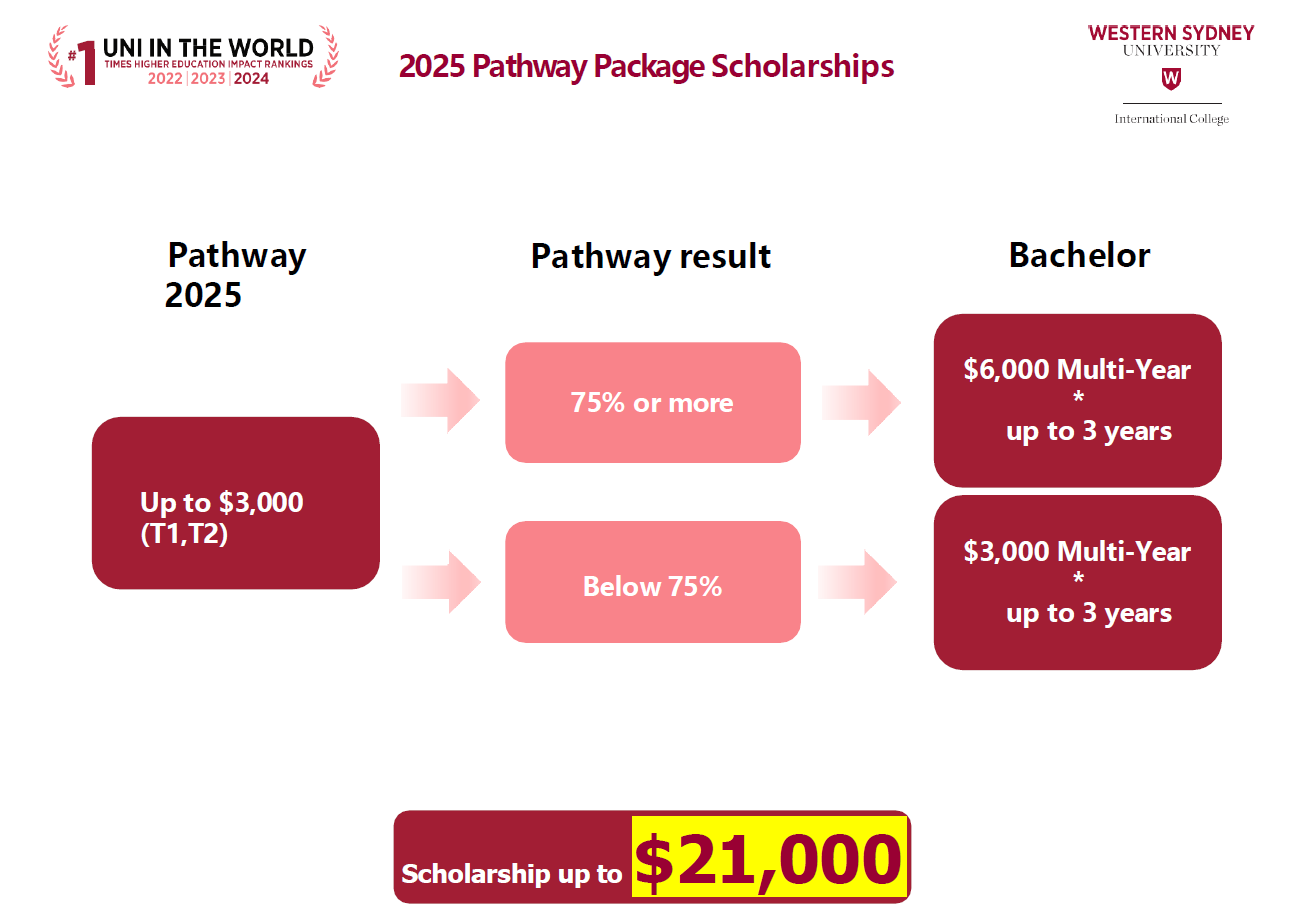- Học bổng chuyển tiếp lên Cử nhân: Từ 3,000 AUD đến 6,000 AUD/năm, xét theo thành tích học tập.