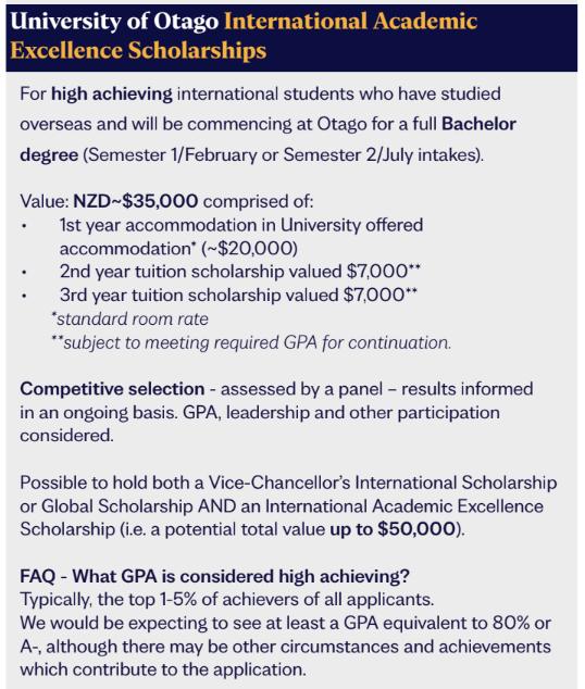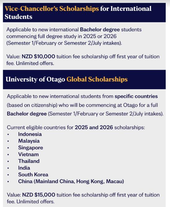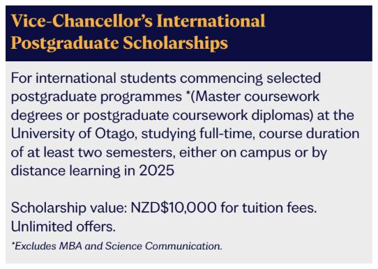 Với chính sách khuyến học cho sinh viên quốc tế, năm 2025, đại học Otago áp dụng học bổng 10,000 NZD cho mọi sinh viên Việt Nam nộp đơn theo học thạc sĩ tại trường. Với chương trình thạc sĩ, sinh viên được phép mang theo gia đình: vợ/ chồng được phép làm việc và con cái được đi học miễn phí.