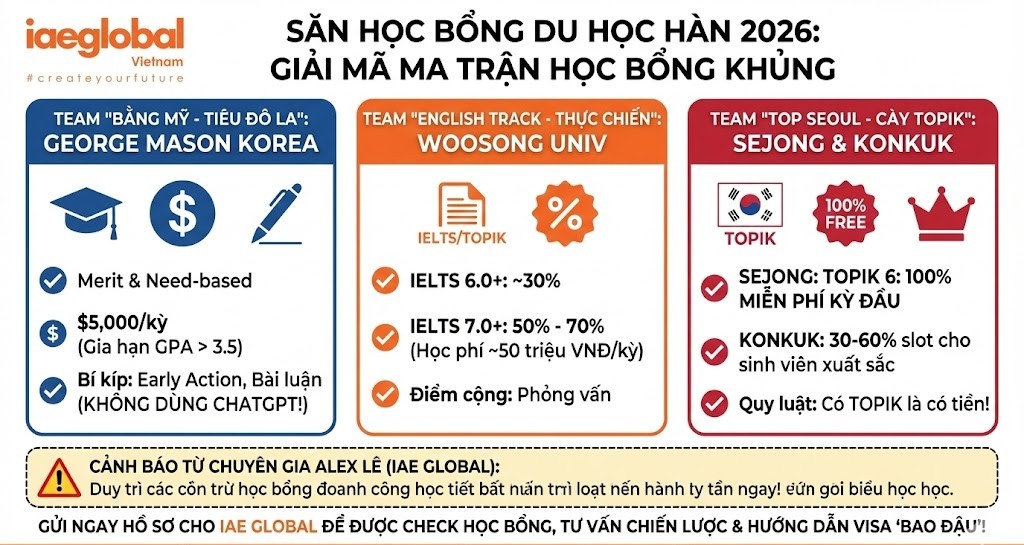 Trong bối cảnh kinh tế năm 2025 nhiều biến động, "Học bổng" không còn là phần thưởng danh dự mà trở thành yếu tố sống còn quyết định việc bạn có thể đi du học hay không. Tuy nhiên, mỗi trường đại học tại Hàn Quốc lại có một "khẩu vị" tuyển chọn nhân tài khác nhau. Dựa trên dữ liệu tuyển sinh chính thức 2025-2026, chuyên gia Alex Lê từ iae GLOBAL Việt Nam sẽ giúp bạn giải mã ma trận này.