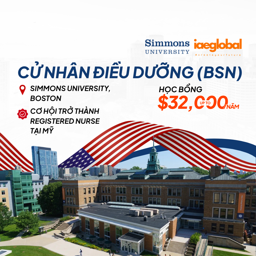 Chương trình Cử nhân Điều dưỡng (BSN) tại Simmons University là lộ trình tối ưu để trở thành Registered Nurse (RN) tại Mỹ với tỷ lệ đỗ kỳ thi NCLEX lên đến 93%. Tọa lạc tại trung tâm y khoa Boston, sinh viên được thực tập tại các bệnh viện hàng đầu thế giới và có cơ hội nhận học bổng lên tới 32,000 USD mỗi năm thông qua sự hỗ trợ từ iae GLOBAL Việt Nam.