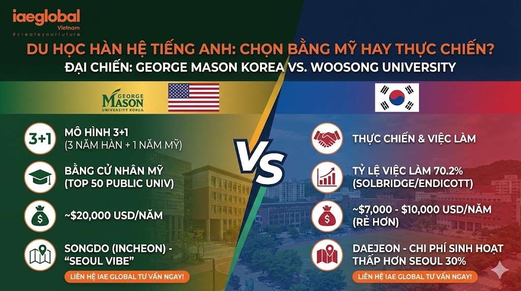 Nếu bạn muốn nhận bằng cấp chuẩn Mỹ từ trường Top-tier R1 và tài chính vững mạnh, George Mason University Korea (GMUK) với mô hình 3+1 (3 năm Hàn, 1 năm Mỹ) là lựa chọn tối ưu. Ngược lại, nếu bạn ưu tiên chi phí sinh hoạt thấp (Daejeon rẻ hơn Seoul 30%), cơ hội việc làm cao (70.2%) và chương trình đào tạo thực tế, Woosong University là điểm đến phù hợp nhất.