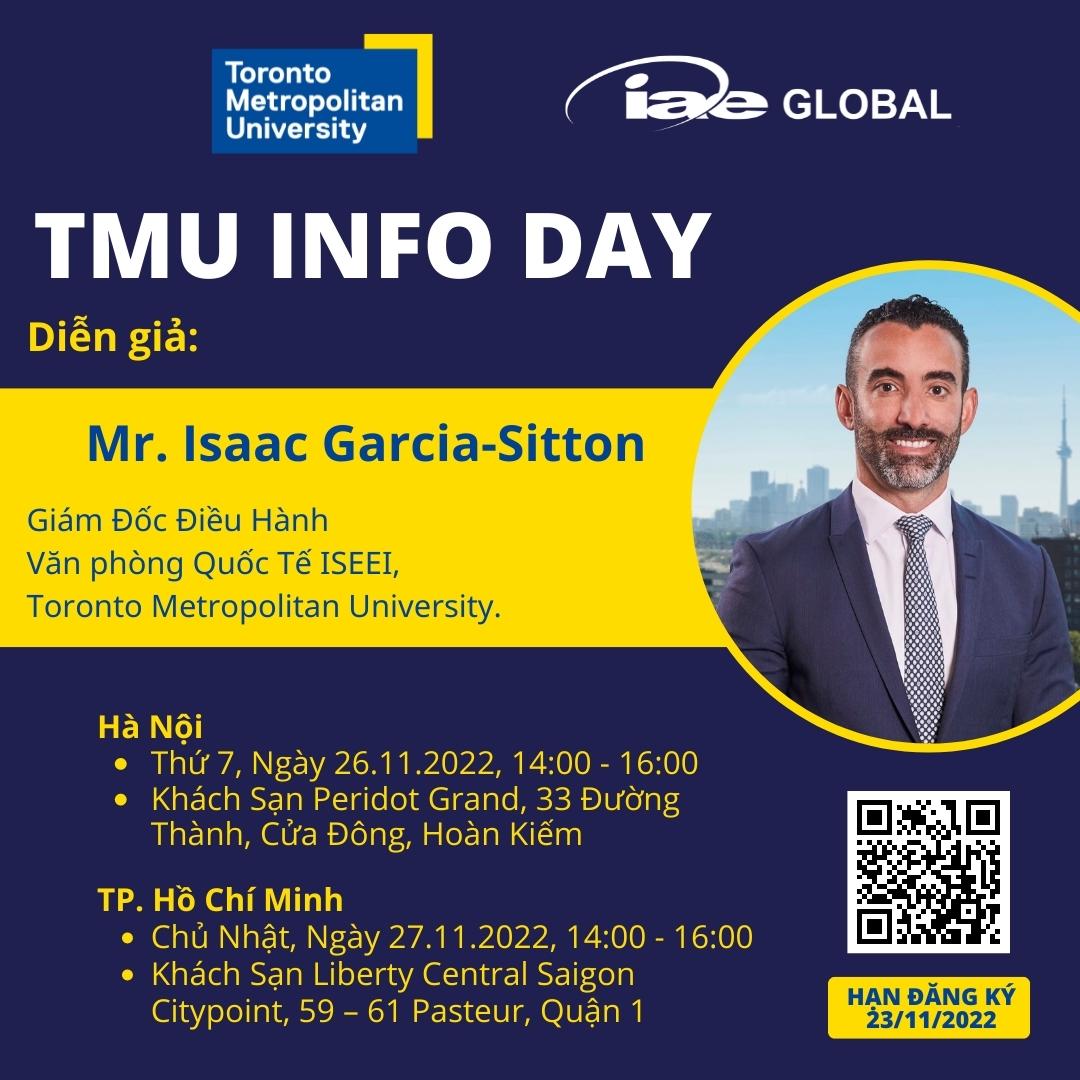 ✨Mr. Isaac Garcia-Sitton, Giám Đốc Điều Hành, Văn Phòng Quốc Tế ISEEI, Toronto Metropolitan University. Ông là một nhà lãnh đạo được kính trọng trong lĩnh vực giáo dục đại học với hơn 20 năm kinh nghiệm. Với những cống hiến to lớn đến cộng đồng người nhập cư Canada, Isaac xuất hiện trong danh sách "10 người Canada gốc Tây Ban Nha có ảnh hưởng nhất” vào năm 2018 và là người chiến thắng Giải thưởng "25 Người nhập cư hàng đầu Canada của RBC" vào năm 2020.