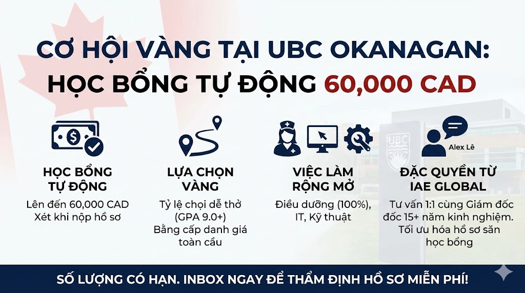 UBC Okanagan (UBCO) thuộc Top 50 đại học nghiên cứu thế giới, tọa lạc tại Kelowna, Canada, nổi bật với quy mô lớp học nhỏ và tỷ lệ việc làm cao. Với điều kiện GPA từ 9.0+, sinh viên quốc tế có cơ hội nhận gói học bổng tự động lên tới 60,000 CAD và lộ trình định cư thuận lợi thông qua các ngành "khát" nhân lực như Điều dưỡng, Khoa học ứng dụng và Công nghệ.