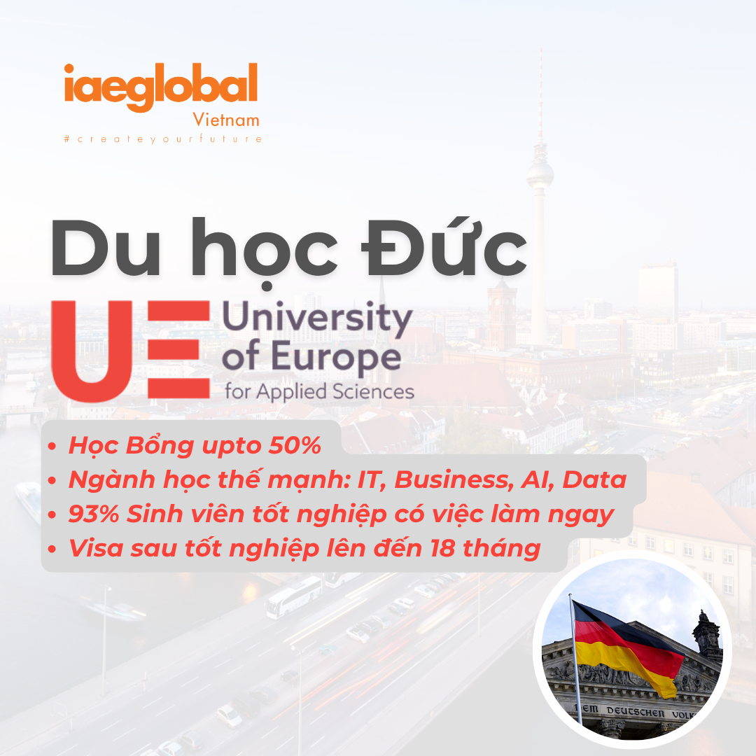 University of Europe for Applied Sciences (UE) là trường đại học tư thục hàng đầu tại Đức, tập trung vào mô hình khoa học ứng dụng với các cơ sở hiện đại ở Berlin, Hamburg, Iserlohn, và Dubai. Trường cung cấp hơn 70 chương trình học (dạy 100% bằng tiếng Anh hoặc Đức) trong các lĩnh vực hot như Kinh doanh, IT & AI, và Nghệ thuật & Thiết kế. UE nổi bật với chính sách tuyển sinh linh hoạt, chấp nhận "gap year" và cơ hội ở lại làm việc với visa 18 tháng sau tốt nghiệp.