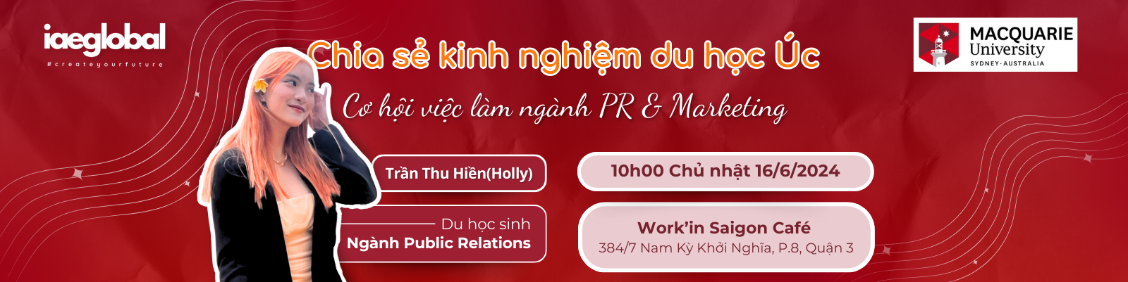 Bạn có đang mơ ước du học và ước mơ được làm việc trong ngành PR & Marketing? Đừng bỏ lỡ cơ hội "có một không hai" để cùng iae GLOBAL Vietnam gặp gỡ trực tiếp Holly Tran - du học sinh Đại học Macquarie, Úc