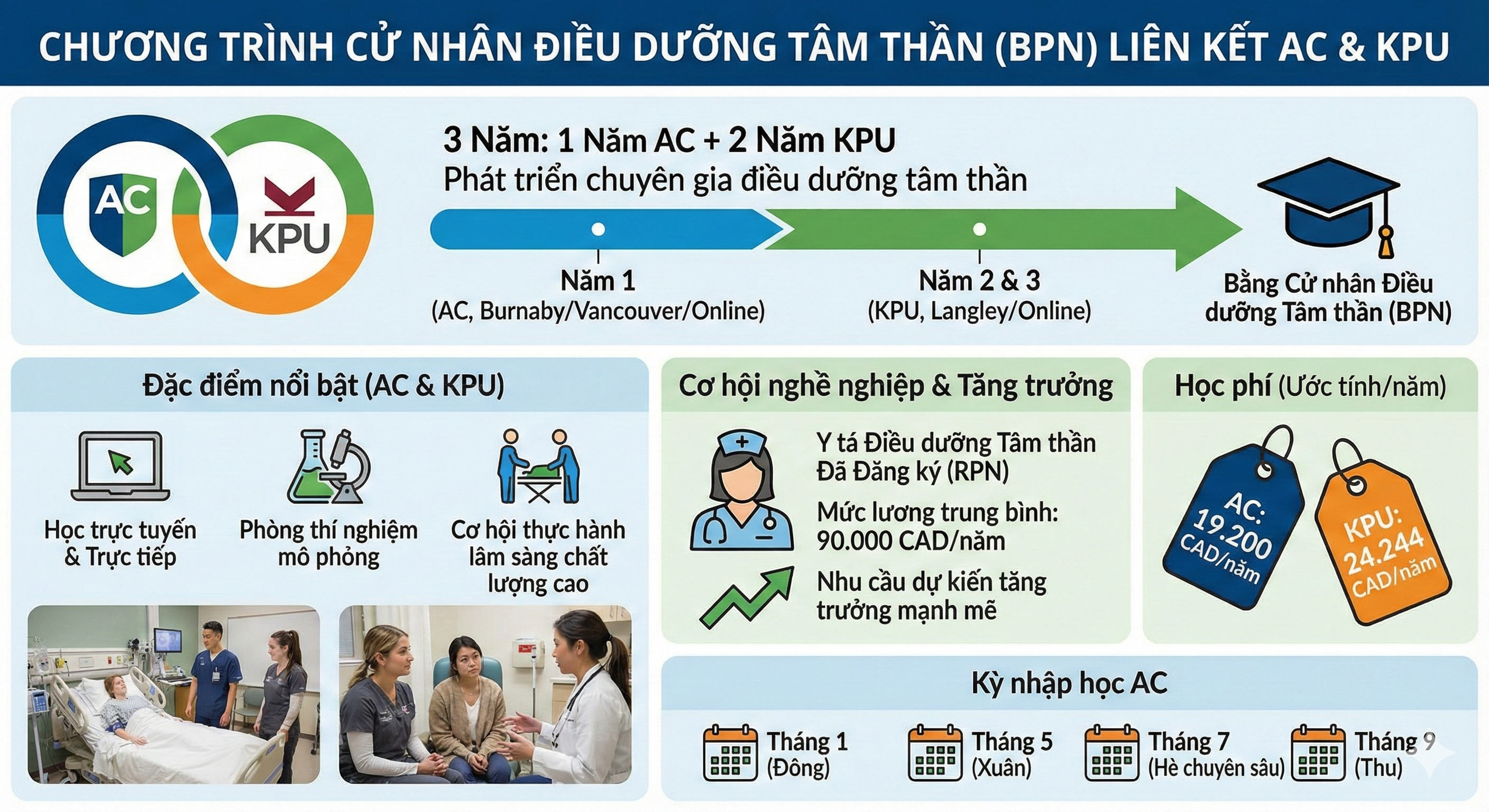 Alexander College (AC) hiện cung cấp hai lộ trình tối ưu cho du học sinh ngành Điều dưỡng tại Canada: Chương trình Cử nhân Điều dưỡng Tâm thần (liên kết KPU) và Chuyển tiếp Cử nhân Khoa học Điều dưỡng sang UBC Okanagan. Đây là giải pháp chiến lược giúp sinh viên tiết kiệm chi phí năm đầu, tích lũy tín chỉ và đảm bảo lộ trình lấy bằng Cử nhân tại các đại học hàng đầu với mức lương đầu ra lên đến 90.000 CAD/năm.