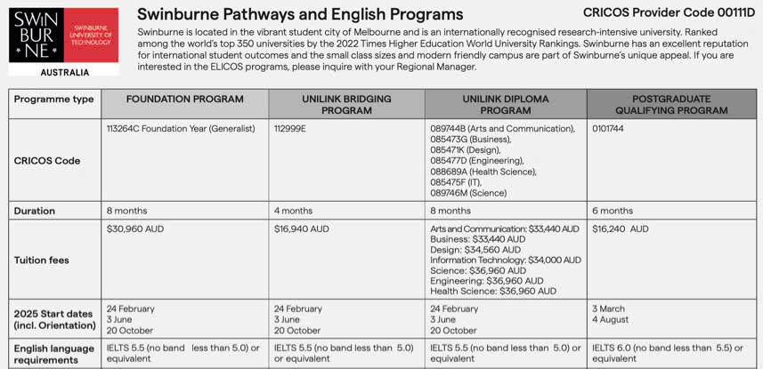Dưới đây là bảng thông tin chi tiết về các chương trình Pathway và English Programs tại Swinburne: