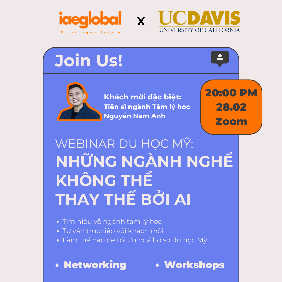 Bạn đang trải qua quá trình chuẩn bị hồ sơ du học Mỹ và muốn đảm bảo rằng mình đang làm đúng và hiểu rõ những yếu tố quan trọng? Bạn đang tìm kiếm thông tin về những ngành nghề đặc biệt, không thể thay thế bởi AI, để chọn lựa cho tương lai sự nghiệp của mình? Hãy tham gia vào webinar của chúng mình cùng 2 khách mời: Daniel & Nam Anh - Tiến sĩ tại Đại học UC Davis để được trả lời ngay!