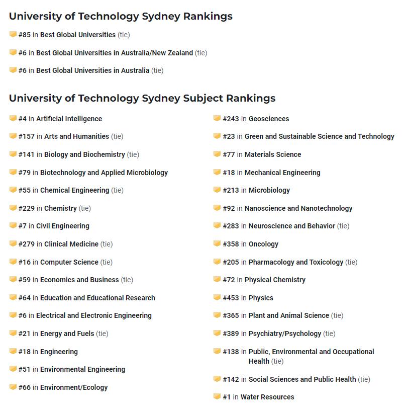 UTS cũng đạt được thành tích mạnh mẽ trong Bảng xếp hạng môn học của các trường đại học toàn cầu tốt nhất (2024-5), được đo bằng hiệu suất nghiên cứu học thuật ở cấp độ môn học. UTS đã được xếp hạng số 1 trên thế giới về Tài nguyên Nước và là số 1 ở Úc về các chủ đề sau: